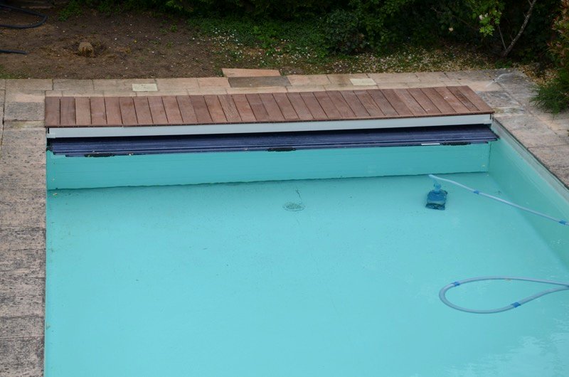 Le volet est en cours de fermeture et viens se ranger derrière le muret de séparation. Nous avons comment dire, reconstruit, rénover le caillebotis en bois exotique qui se trouvait au-dessus du volet. Pour cela, nous avons installé un joli caillebotis en lames de terrasse en cumaru.