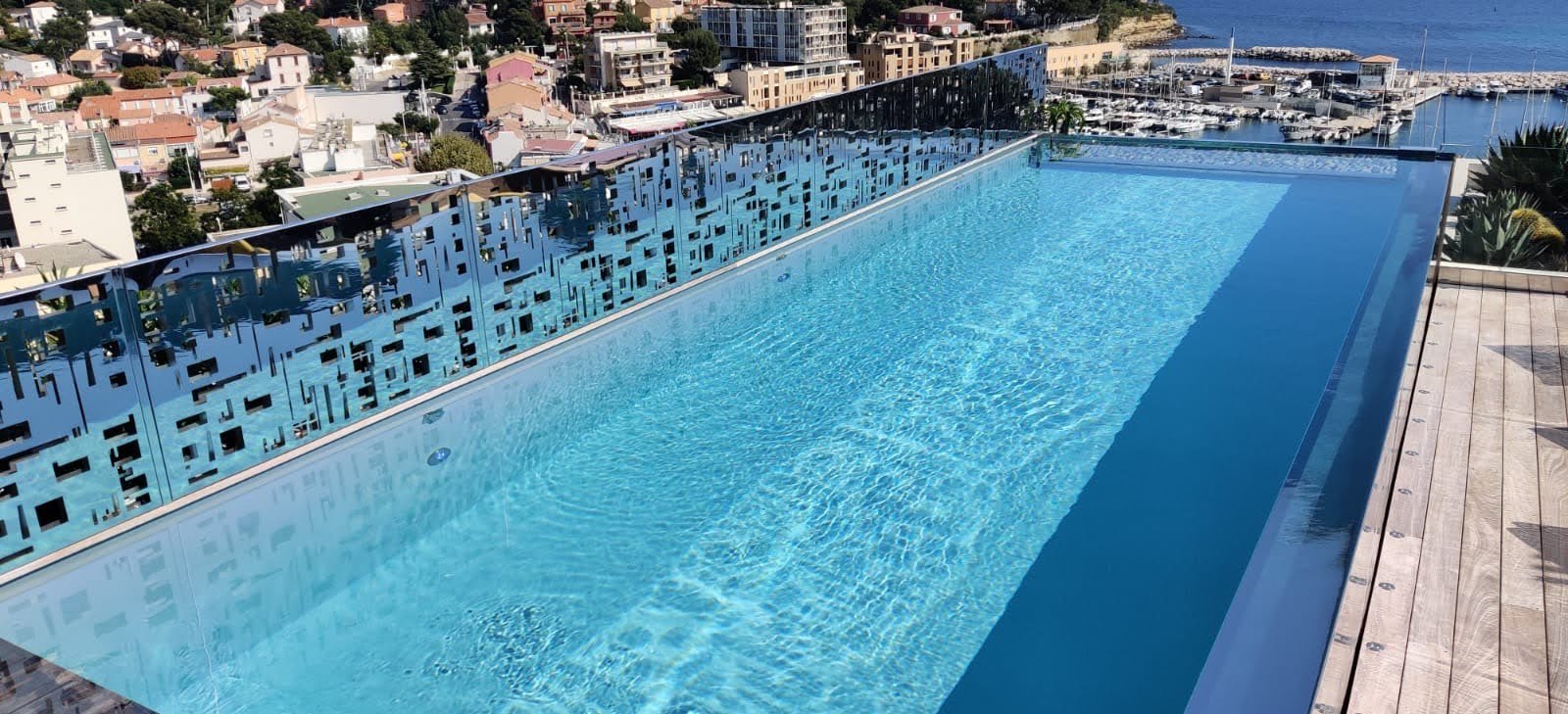 L’un des avantages des bassins en acier préfabriqué monobloc est de permettre leur installation dans des situations particulières. Par exemple, ce bassin a été installé sur le toit d’un hôtel au bord de la mer.