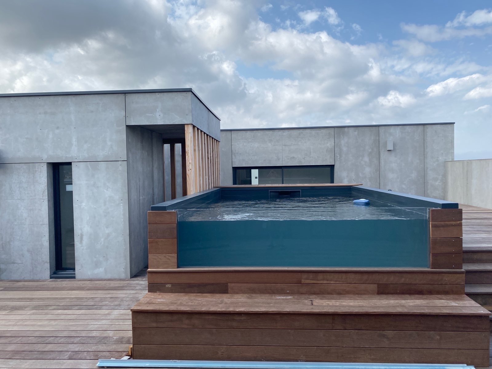 Voici un petit bassin dans un esprit très contemporain devant une construction en béton brut, avec un habillage bois. Du fait que le bassin est hors-sol, nous avons installé une une belle plaque transparente permettant de voir l’intérieur de la piscine depuis la terrasse.