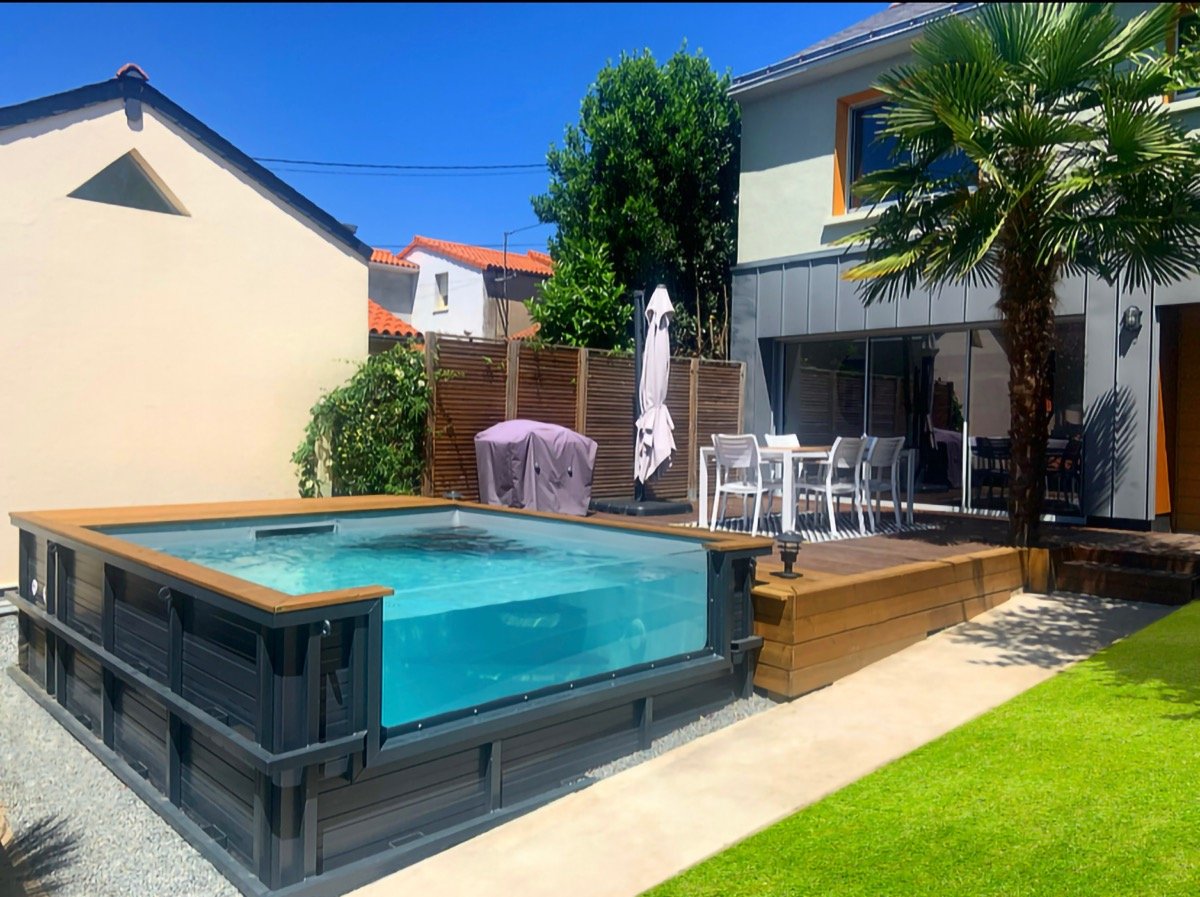 Voici une une jolie piscine hors-sol adossée à la terrasse, en bois, avec une belle structure en acier anthracite, dans un esprit contemporain, agrémentée par une grande plaque transparente qui permet de donner une perspective sur le jardin.