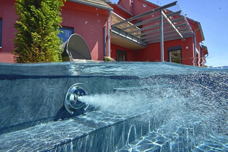 Ici, le fond mobile de la piscine est totalement descendu au fond du bassin. Cela permet de profiter de la piscine pour nager et plonger. Nous voyons également les marches et les contre-marchés dallées qui créent un espace plage immergée sur lequel se reposer.